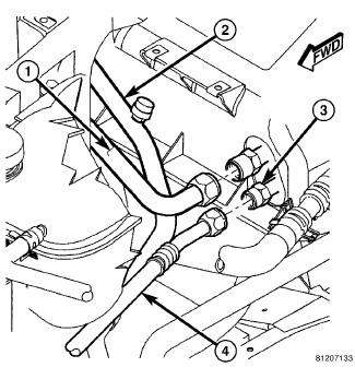 1. Position the front section of the A/C suction line (4) into the engine compartment.
