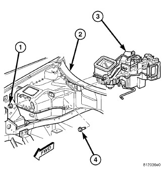 6. Install the two nuts (1) and one bolt (4) that secure the HVAC housing (3) to the dash panel (2) in the passenger compartment. Tighten the nuts and bolt 7 Nm (60 in. lbs.).