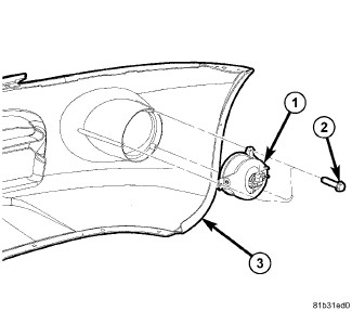 4. Remove the three screws (2) attaching fog lamp unit (1) to front bumper fascia (3).