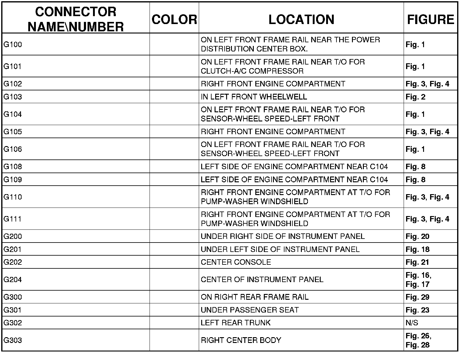 The abbreviation T/O (Take Out) is used in the location column to indicate a point in which the wiring harness branches out to a component.