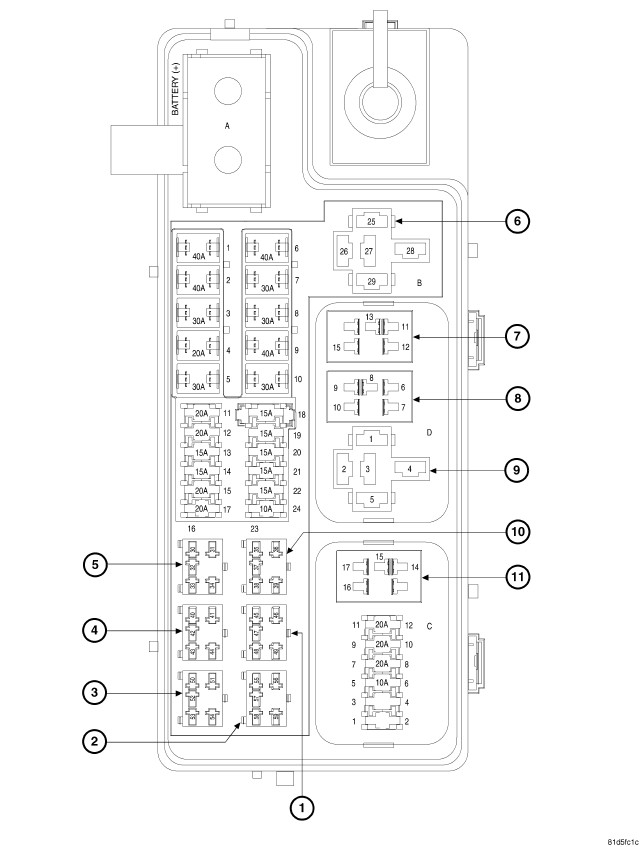 A mini-power distribution center is located in the engine compartment on the passenger's side of the vehicle. This center contains radiator fan control relays and has two externally-mounted 40 Amp fuses for the radiator fans.