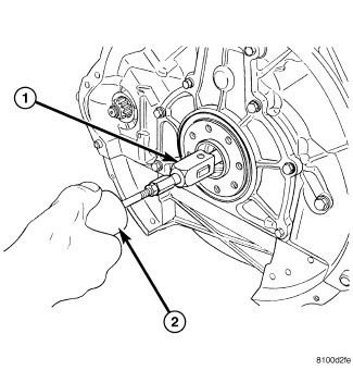 3. Using seal remover 8990 (1) and slide hammer C-3752 (2) remove pilot bearing from crankshaft.