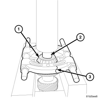 1. Remove countershaft adapter bearings (1) with Adapter 9377 (2) Splitter 1130 (3) and a press.