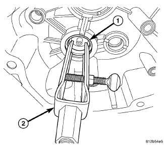 1. Position Puller C-293-PA (1) and Adapters C-293-47 (2) on mainshaft bearing. Place Button 10027 in end of mainshaft.