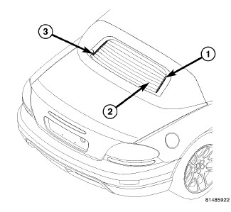 The rear window defogger system, also known as electric backlight (EBL), consists of two vertical bus bars (1) linked by a series of grid lines (2) fired onto the inside surface of the rear window glass (3).