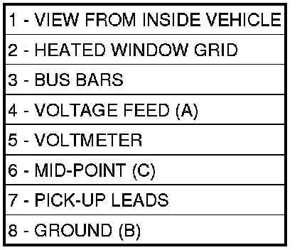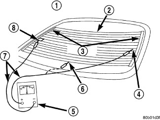 3. If a temperature difference is not detected, use a 12-volt DC voltmeter (5) and contact the rear glass heating grid power feed terminal (4) with the positive lead, and the ground terminal (8) with the negative lead. The voltmeter should read battery voltage. If the voltmeter does not read battery voltage, check the following: