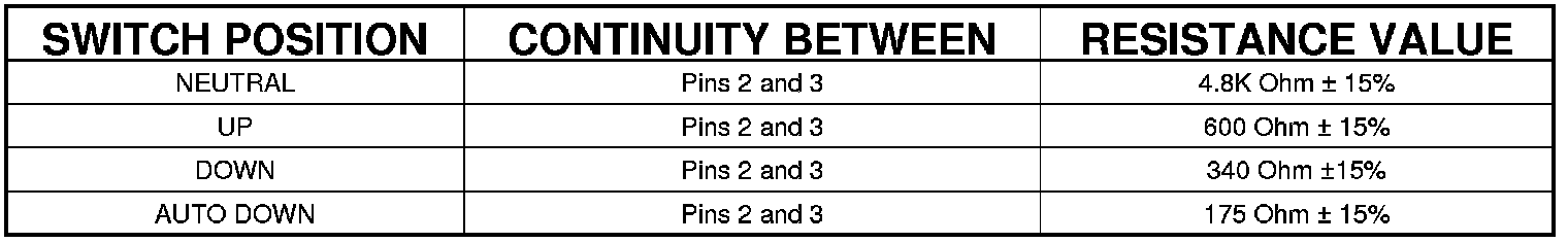 Remove the switch Power Window Switch - Removal. Using an ohmmeter, refer to the power window switch resistance test table to determine if resistance is correct. If the correct results are not obtained, replace the switch.