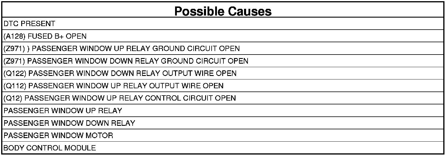 - Repair the (Q12) Passenger Window Up Relay Control circuit for an open.