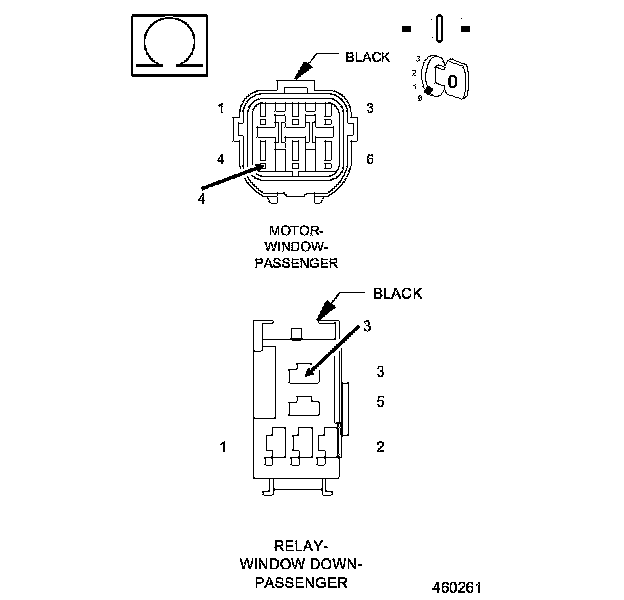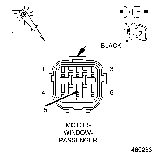 1. Using a 12-volt test light connected to 12-volts, check the (Z971) Relay Ground circuit by probing the (Q122) Passenger Window Down Relay Output circuit in the motor connector.
