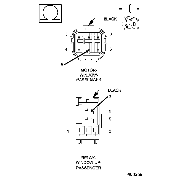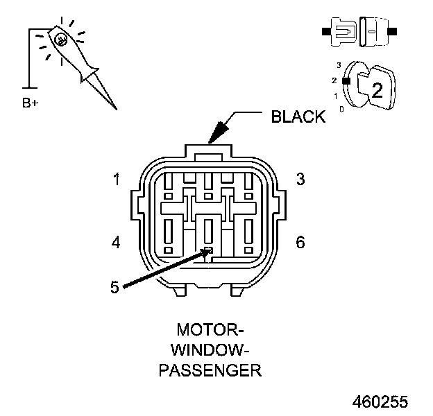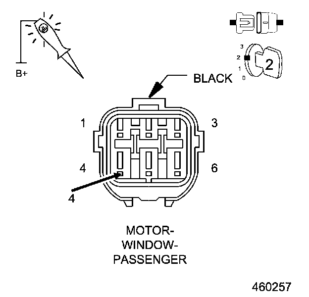 1. Using a 12-volt test light connected to ground, check the (Q122) Passenger Window Down Relay Output circuit in the motor connector.