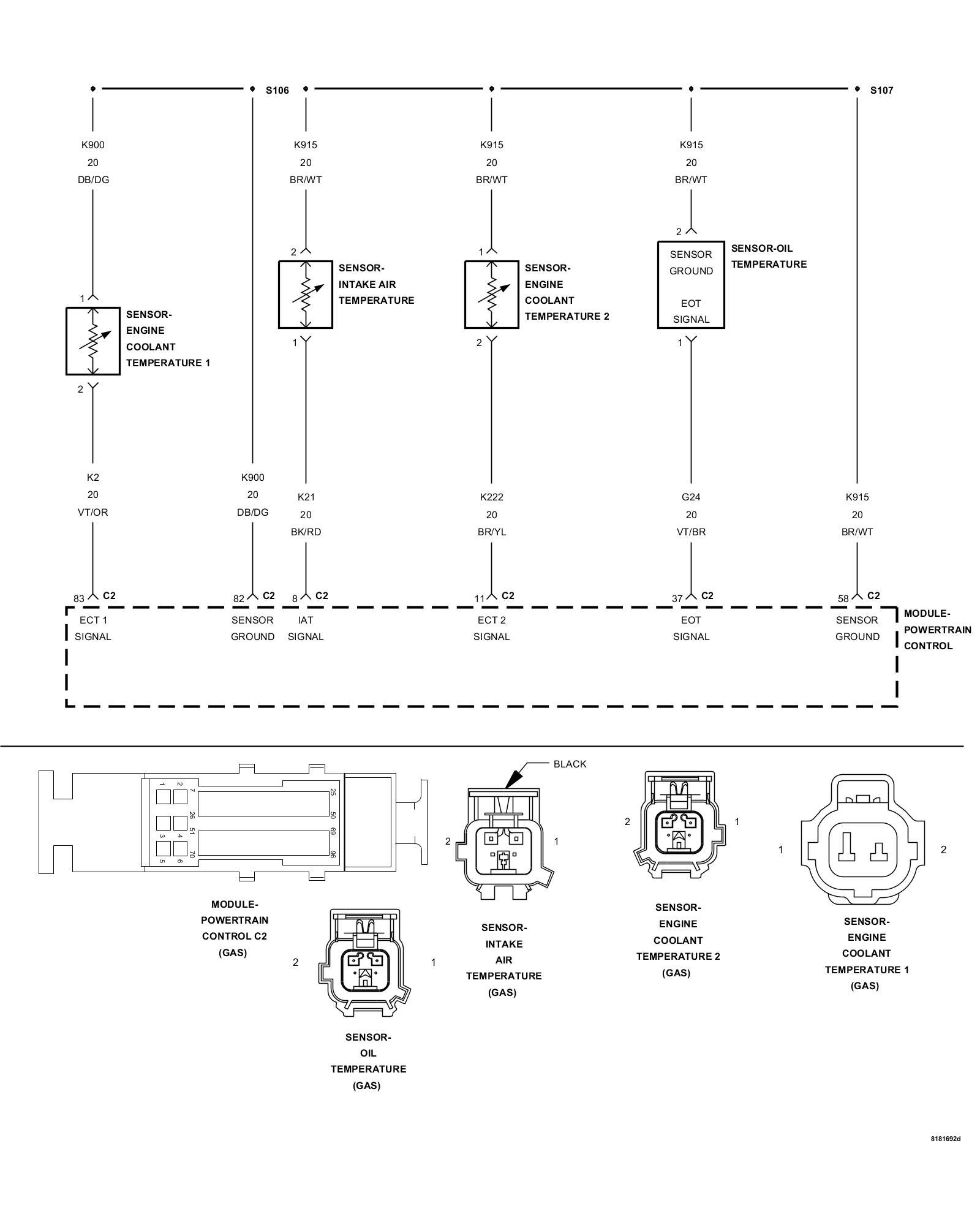 1. Using the wiring diagram/schematic as a guide, inspect the wiring and connectors between the Engine Coolant Temperature Sensor and the Powertrain Control Module (PCM).