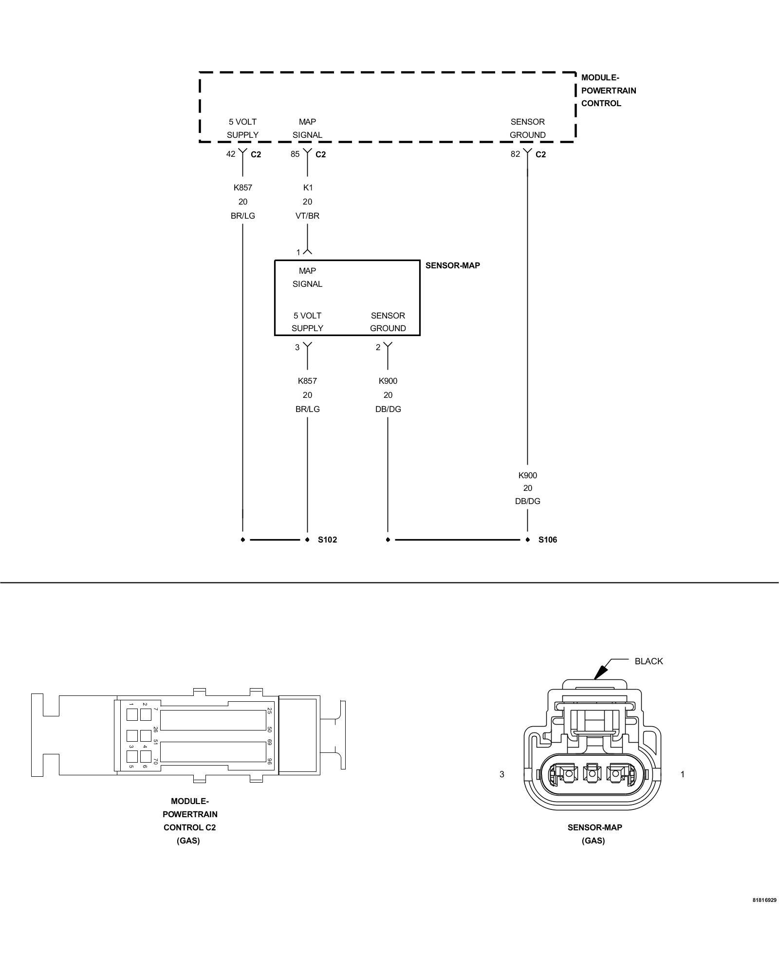 1. Using the wiring diagram/schematic as a guide, inspect the wiring and connectors between the MAP Sensor and the Powertrain Control Module (PCM).