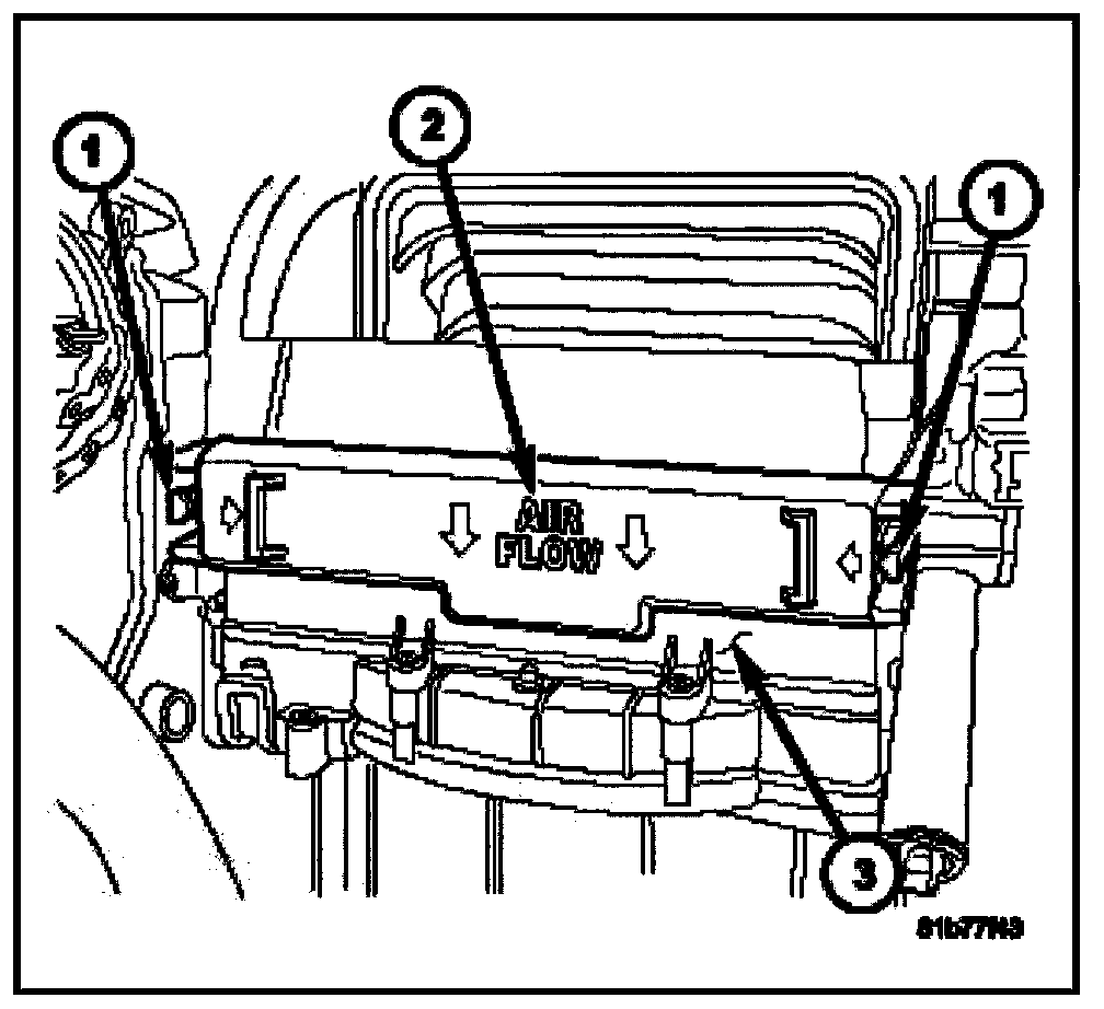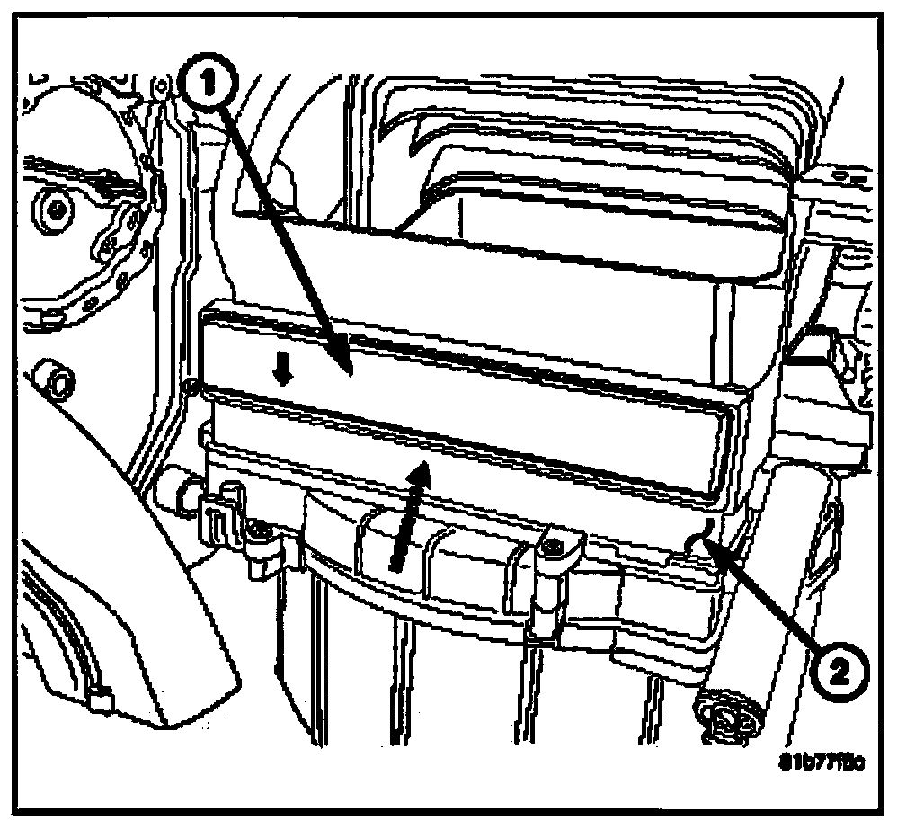 1. Install the particulate air filter (1) into the filter opening in the HVAC housing (2). Insert the particulate air filter directly into the housing with the arrow on the filter pointing to the floor.