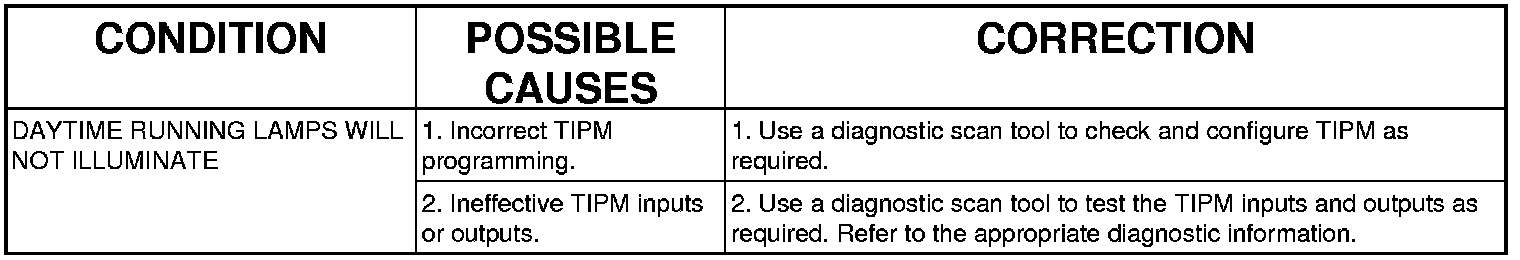 NOTE: Before performing the following tests, determine whether the headlamp low and high beams operate. If the headlamp low and high beams are also inoperative, diagnose and repair that problem before attempting to repair the Daytime Running Lamps.