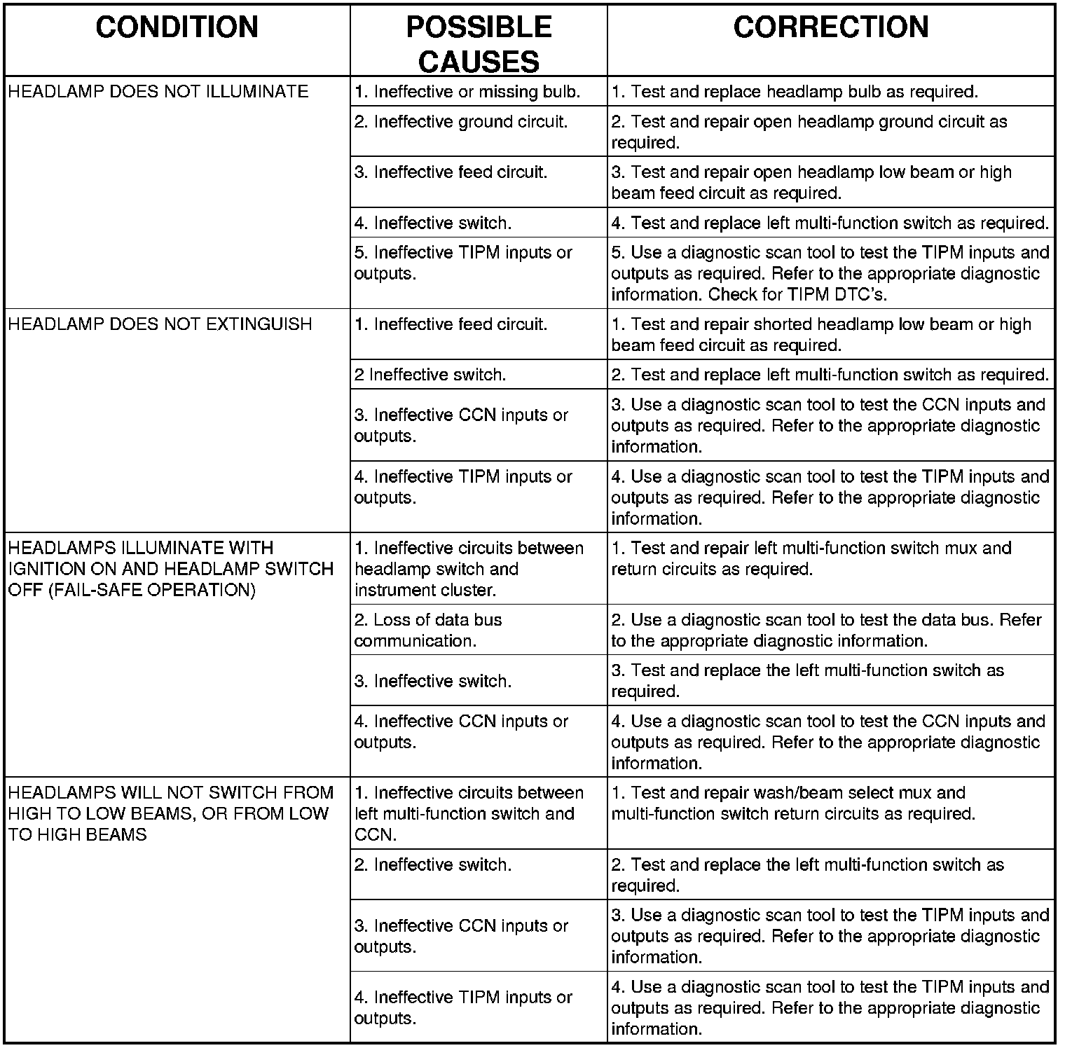 NOTE: As part of the exterior lighting failsafe feature, upon ignition On all exterior park lamps and the headlamp low beams will illuminate regardless of the headlamp switch position if the CCN cannot detect an input from the headlamp switch, or if there is a loss of data bus communication.