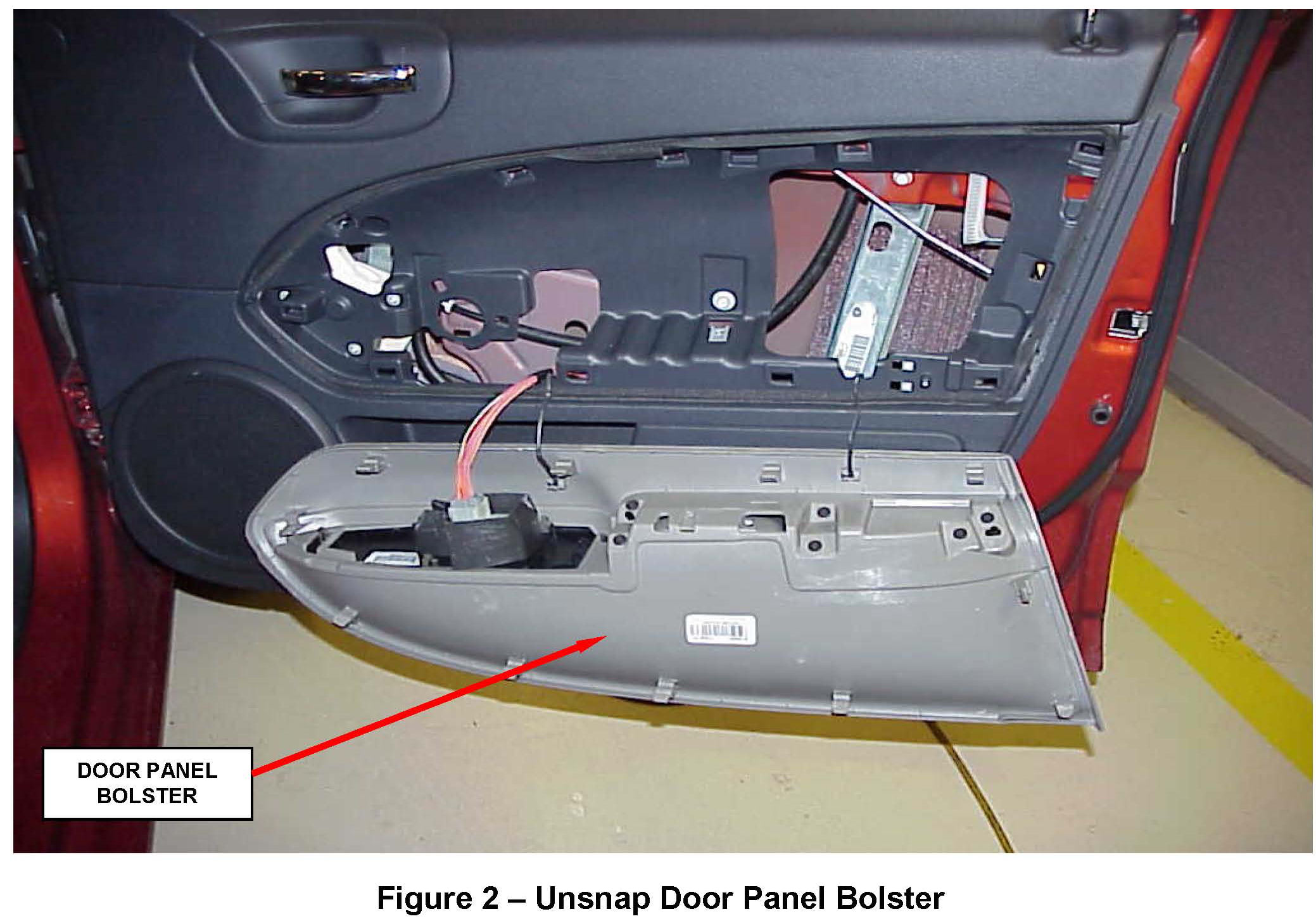 5. Using plastic trim stick C4755 or equivalent, carefully unsnap the bolster from the door panel (Figure 2).