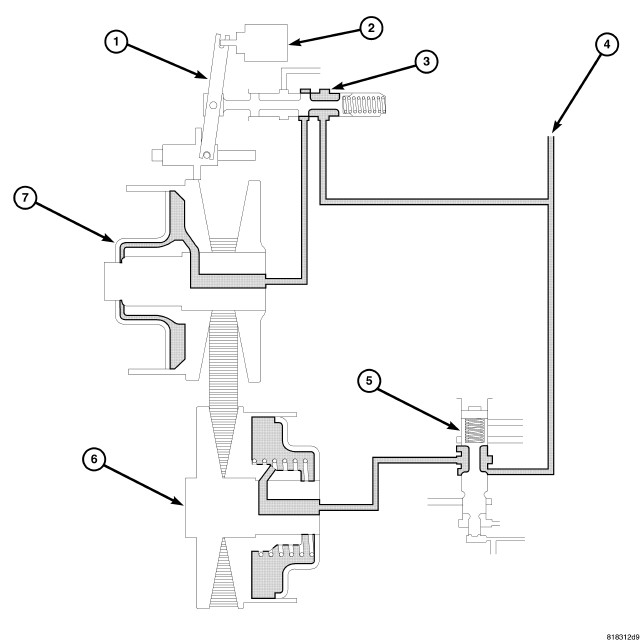 Additionally, the sliding element of the primary pulley moves to the right direction and the ratio control valve also moves to the right side and closes the line pressure circuit; this is a completion of the shift.