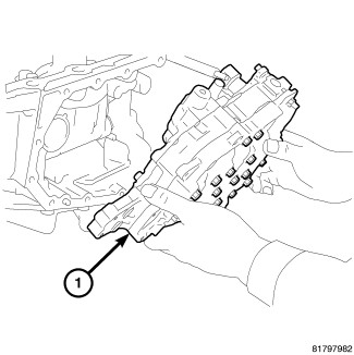 61. Install the valve body assembly (1) up from the bottom side and install it into the transaxle case.