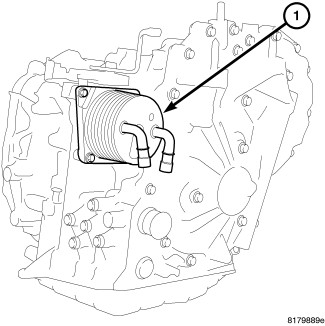 104. Install the CVT fluid cooler (1) onto the transaxle case. Install and tighten the mounting bolts to 4 Nm (37 in.lbs.).