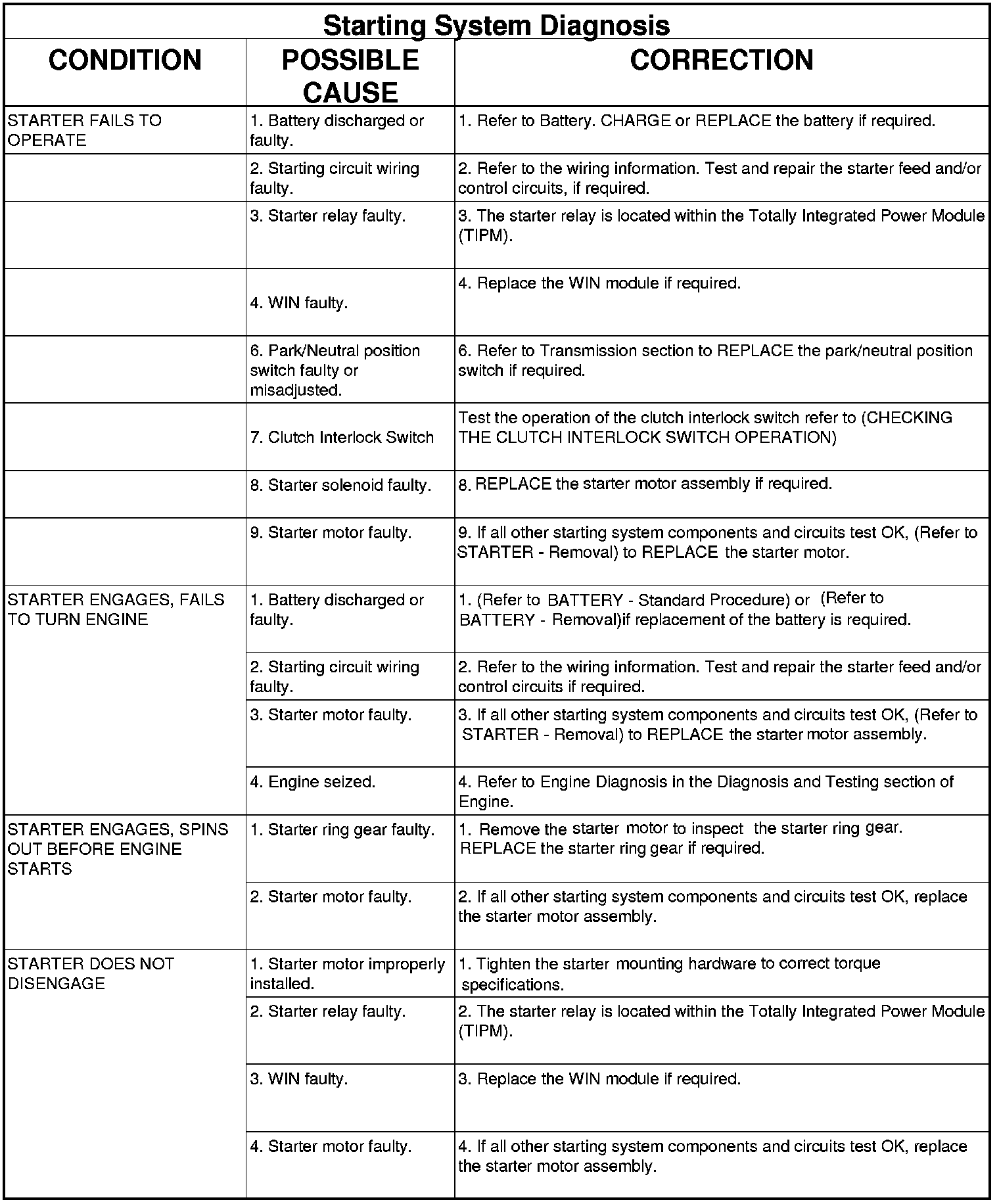 The starter control circuit components should be tested in the order in which they are listed, as follows: