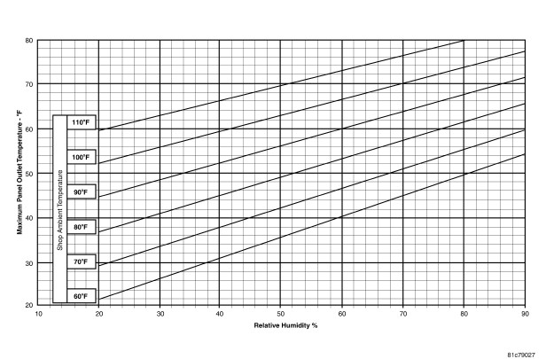 5. With the A/C compressor clutch engaged, compare the observed panel outlet air temperature along with ambient temperature and the relative humidity of the work area to the Maximum Panel Outlet Temperature chart.