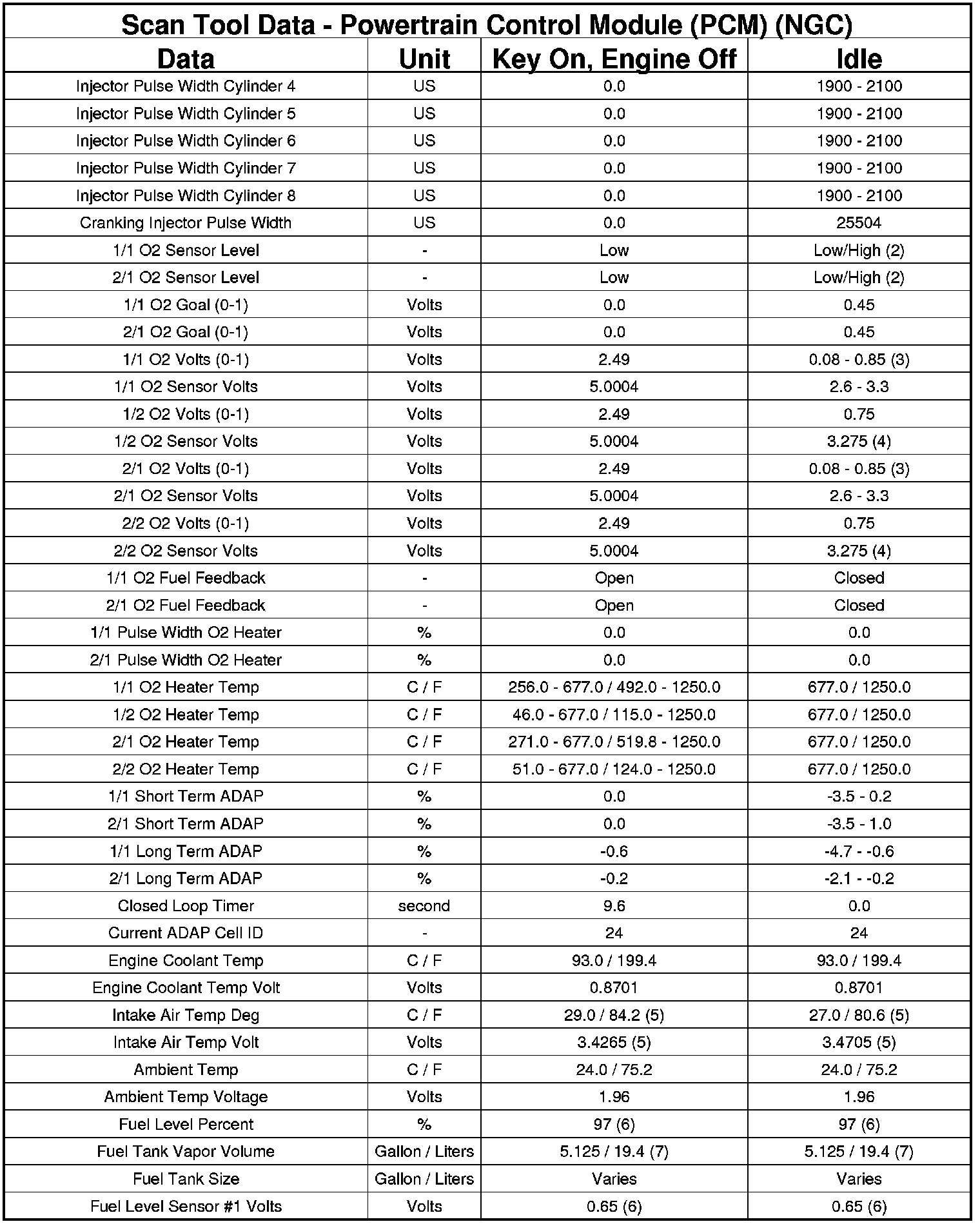 The following chart lists data values taken from the Scan Tool Powertrain Control Module (PCM) data list for the NGC controller. The values were taken at key on, engine off and at idle. The data is to be used for reference only.