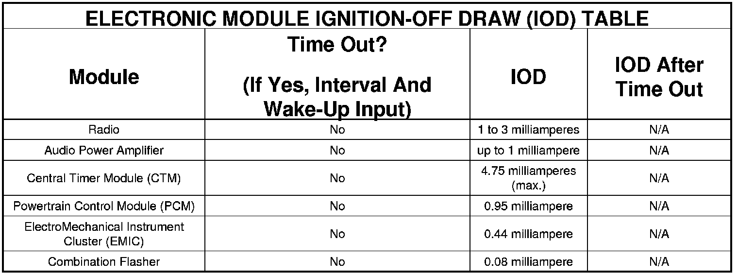 The term Ignition-Off Draw (IOD) identifies a normal condition where power is being drained from the battery with the ignition switch in the Off position. A normal vehicle electrical system will draw from five to thirty-five milliamperes (0.005 to 0.035 ampere) with the ignition switch in the Off position, and all non-ignition controlled circuits in proper working order. Up to thirty-five milliamperes are needed to enable the memory functions for the Powertrain Control Module (PCM), digital clock, electronically tuned radio, and other modules which may vary with the vehicle equipment.