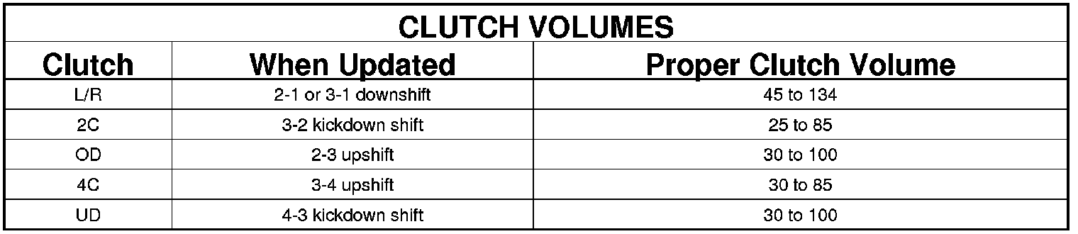 Certain mechanical problems within the input clutch assembly can cause inadequate or out-of-range element volumes. Also, defective Input/Output Speed Sensors and wiring can cause these conditions. The following chart identifies the appropriate clutch volumes and when they are monitored/updated: