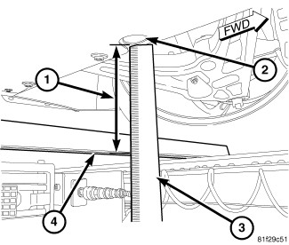 9. Measure and record vehicle's rear design height. Measure distance (1) straight up from bottom of straightedge (4) to each frame rail at the nearest point to the Principle Locating Point (PLP) hole (2) (not belly pan).