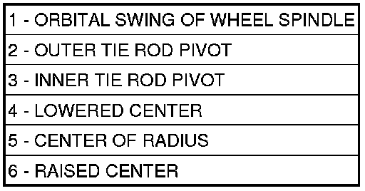 Wheel toe pattern is regulated by the vertical positioning of the inner tie rod pivot (3) in relation to the orbital swing of the wheel spindle (1). Wheel toe settings have no effect on toe pattern. When the suspension is fully compressed and then extended with the tie rod disconnected from the spindle, the spindle makes an arc in space without altering the toe pattern. When the arc of the spindle is extended into a full circle and the inner tie rod end is positioned in the center of the circle, the toe pattern cannot change. When the inner tie rod is raised or lowered from the center of the true circle of the spindle arc, the toe pattern will vary. When the suspension is compressed (jounce), the wheel toe should change from normal riding height. When the suspension is extended (rebound), wheel toe should move in the opposite direction. Front suspension jounce should cause the wheels to toe out; rebound should cause the wheels to toe in. Rear suspension jounce should cause the wheels to toe in; rebound should cause the wheels to toe out.