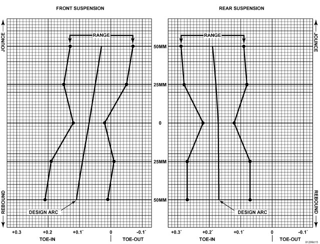 12. Lower front and rear of vehicle 50 mm (2 in.) below design height (Jounce). Measure and record front and rear toe at each wheel.