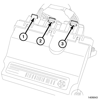 3. If the vehicle is so equipped, reconnect the black 12-way electrical connector (3), then the brown 20-way electrical connector (2) followed by the black 10-way electrical connector (1) to the door control module connector receptacles.