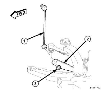 6. Attach the stabilizer bar link (1) at each end of the stabilizer bar (2). At each link, install and tighten the nut (3) while holding the stabilizer bar link lower stud stationary. Tighten the nuts to 48 Nm (35 ft. lbs.).