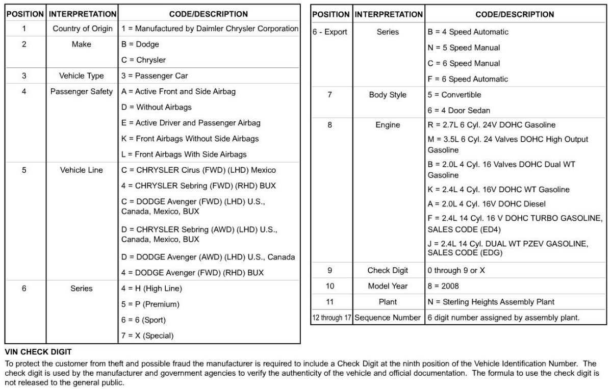 Vehicle Identification Number Decoding Chart