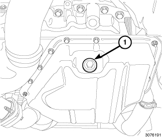 9. Install the drain plug (1) in the oil pan and tighten to 27 Nm (20 ft. lbs.).