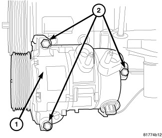 3. Install the three bolts (2) that secure the A/C compressor to the engine. Tighten the bolts to 25 Nm (18 ft. lbs.).