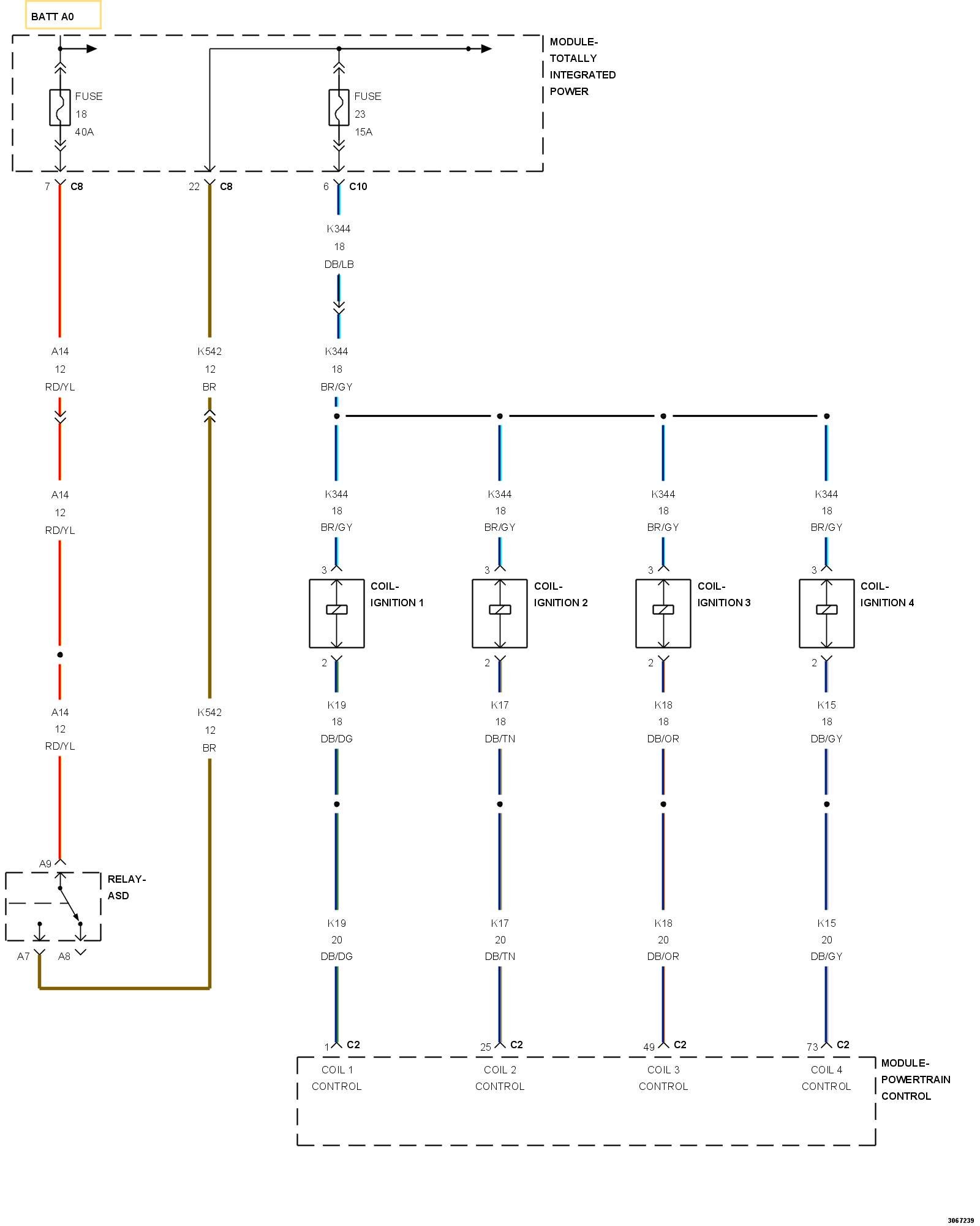 5. Using a 12-volt test light connected to ground, check the ASD Relay output circuit in the ignition coil harness connector.