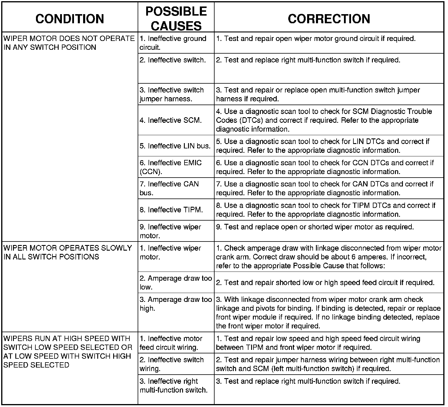 If the front wiper motor operates, but the wipers do not move on the windshield, replace the ineffective front wiper module. If the washer pump/motor operates, but no washer fluid is dispensed on the glass; or, if the wipers operate, but chatter, lift, or do not clear the glass, clean and inspect the front wiper and washer system components as required.