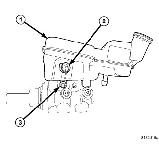 The brake fluid level switch (2) is mounted through the center of the fluid reservoir (1). The switch can be serviced separately from the master cylinder fluid reservoir.