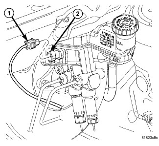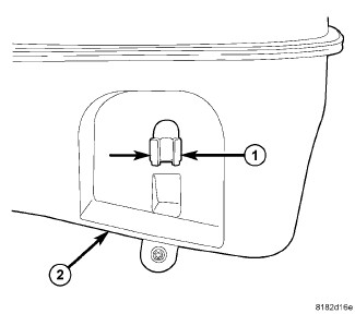 1. Align the brake fluid level switch with its mounting hole on the right side of the master cylinder brake fluid reservoir. Push the switch into the fluid reservoir until the switch retaining tabs (1) are expanded on the opposite side of the reservoir (2), locking it in place.