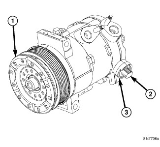 All gasoline engine models use a Denso 6SEU16 clutchless, variable displacement, swashplate type A/C compressor (1). This A/C compressor has a total displacement of 160 cubic centimeters (9.7 cubic inches) and has a control valve (2) and high pressure relief valve (3) located on the back cover.