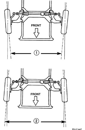 Toe-out on turns (1), sometimes referred to as Ackerman Steering, is the relative positioning of the front wheels while steering through a turn. This compensates for each front wheel's turning radius. As the vehicle encounters a turn, the outboard wheel must travel in a larger radius circle than the inboard wheel. The steering system is designed to make each wheel follow its particular radius circle. To accomplish this, the front wheels must progressively toe outward as the steering is turned from center. This eliminates tire scrubbing and undue tire wear when steering a vehicle through a turn.