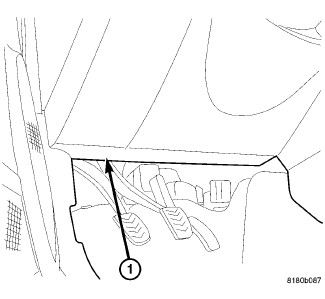 The Data Link Connector (DLC) (1) is a 16-way molded plastic connector that is part of the instrument panel wire harness. This connector is located at the lower edge of the instrument panel, outboard of the steering column. The connector insulator is retained by integral snap features within a rectangular cutout in a mounting bracket integral to the lower instrument panel and inboard of the inside hood release on the inner cowl side trim.