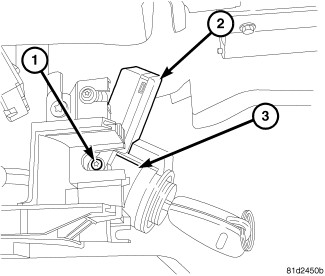 8. Install and tighten the screw (2) that secures the mounting tab on the back of the right multi-function switch (1) to the mounting bracket on the clockspring (3).
