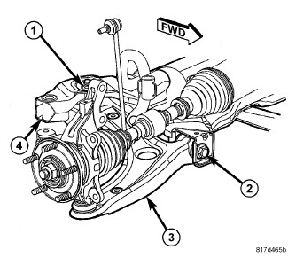 4. Install, but do not fully tighten, the front bolt (2) attaching the lower control arm to the crossmember.