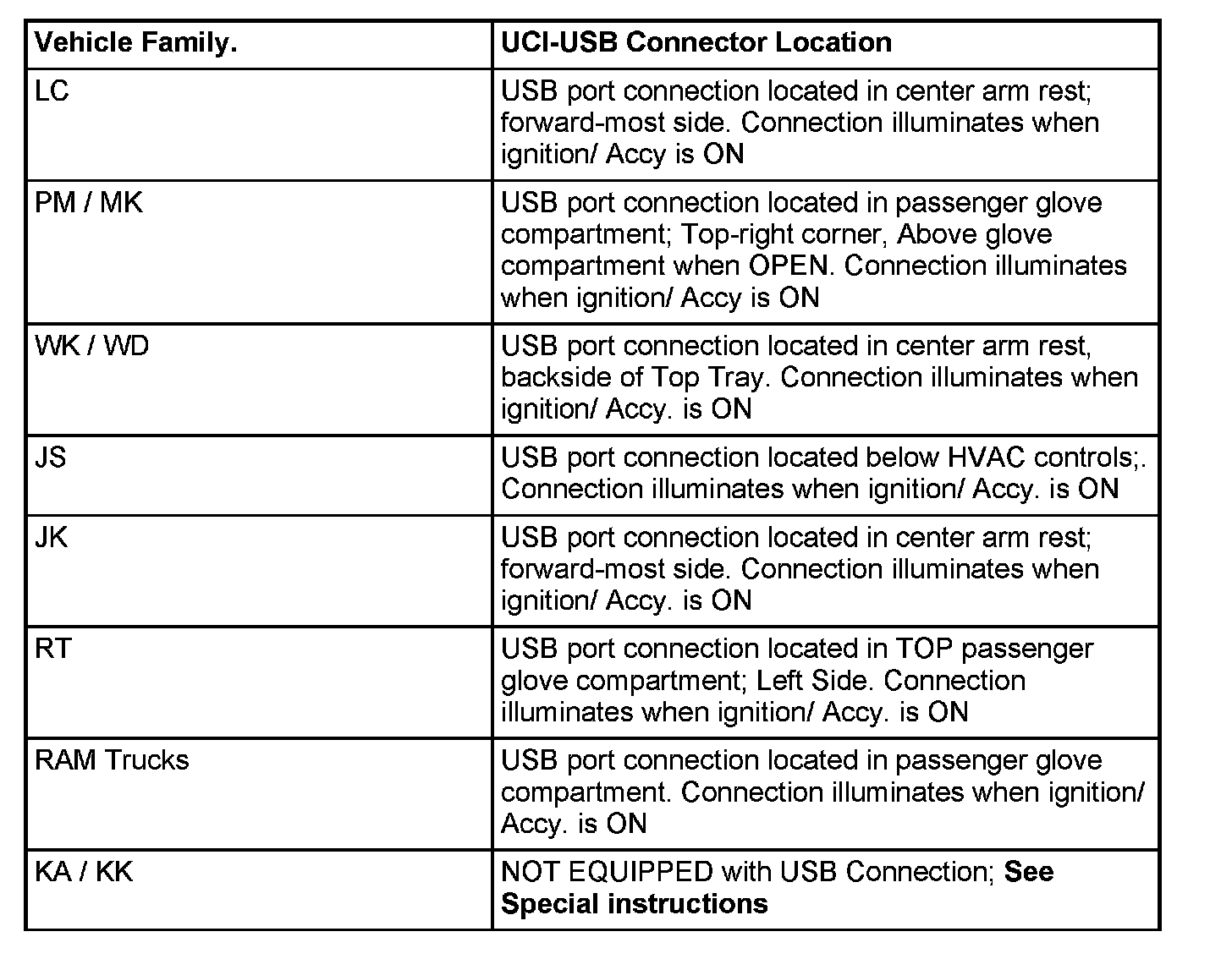 The 2011 KA (Nitro) and KK (Liberty) are not equipped with the USB port. They have the capability of being upgraded by using the MOPAR PN # 82212160 (USB Harness) for the reflash process.