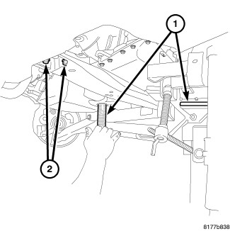 32. Remove bolts (2) at the transmission cross member.