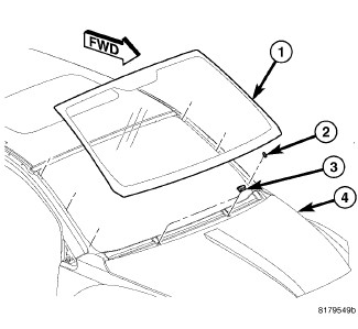 4. Install a new rubber seal (2) along the top of the windshield (1).