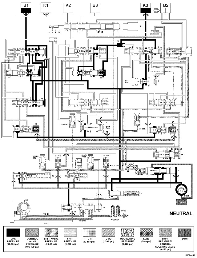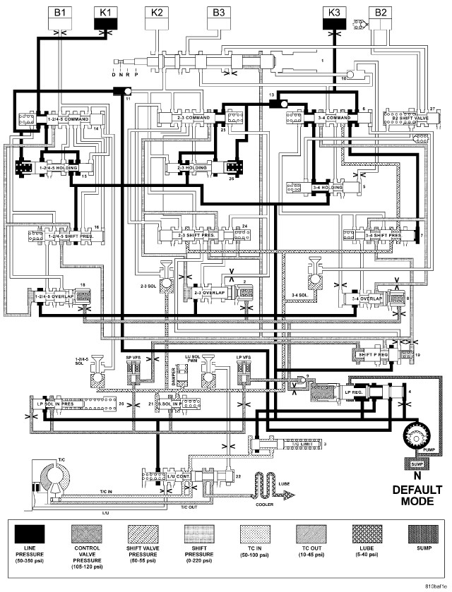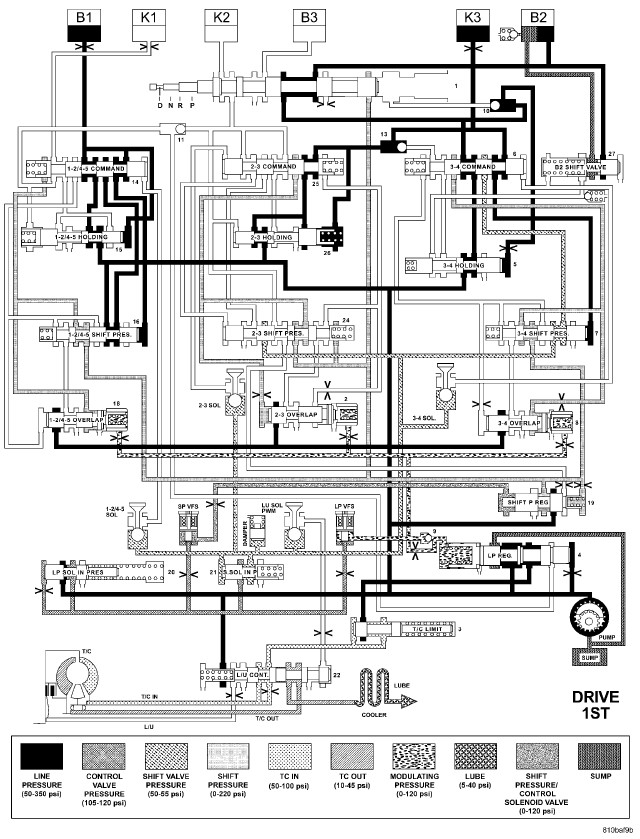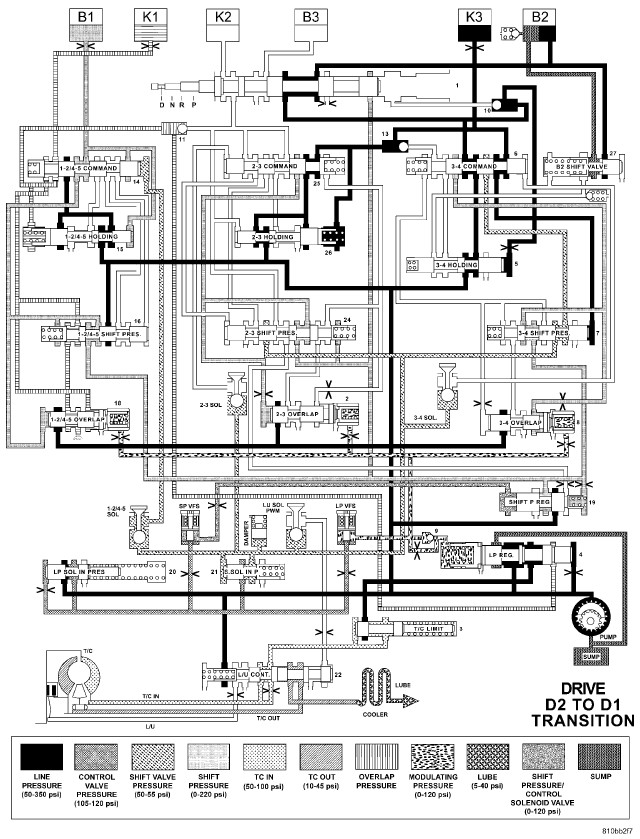 HYDRAULIC FLOW IN DRIVE - SECOND TO FIRST GEAR TRANSITION