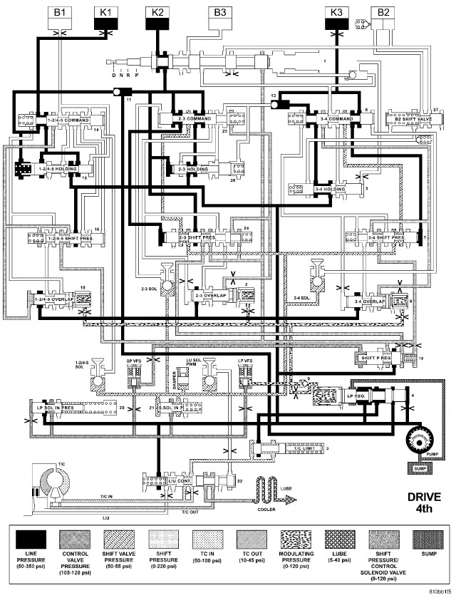 HYDRAULIC FLOW IN DRIVE - THIRD TO FOURTH GEAR TRANSITION